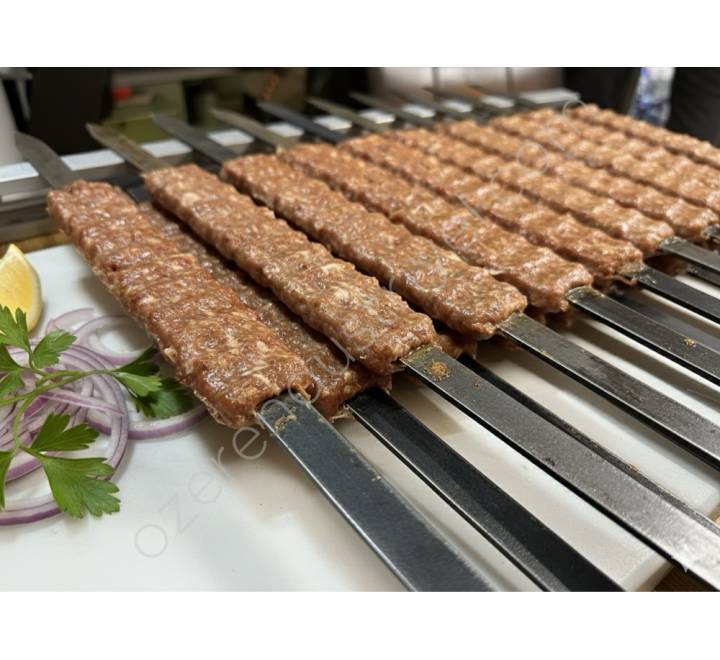 Şiş, ızgaraya atılmaya hazır, tamamen düzgün şekil almış bir Adana kebap halindedir.